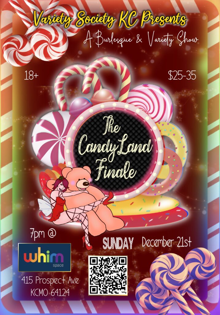 The CandyLand Finale – A Burlesque + Variety Show December 21st, 2025 | Whim Space Doors: 6:30 PM | Show: 7:00 PM 18+| Tickets: $25 General Admission, Front Row $35 Join us for our farewell show! With holiday cheer in the air, we are celebrating the sweet sweet journey of Variety Society KC. This is our final event of the year, as we are taking an indefinite break before bringing back shows to Kansas City's entertainment scene. Enjoy our final hurrah with what we do best- another amazing burlesque and variety show! Tickets available now! More details coming soon